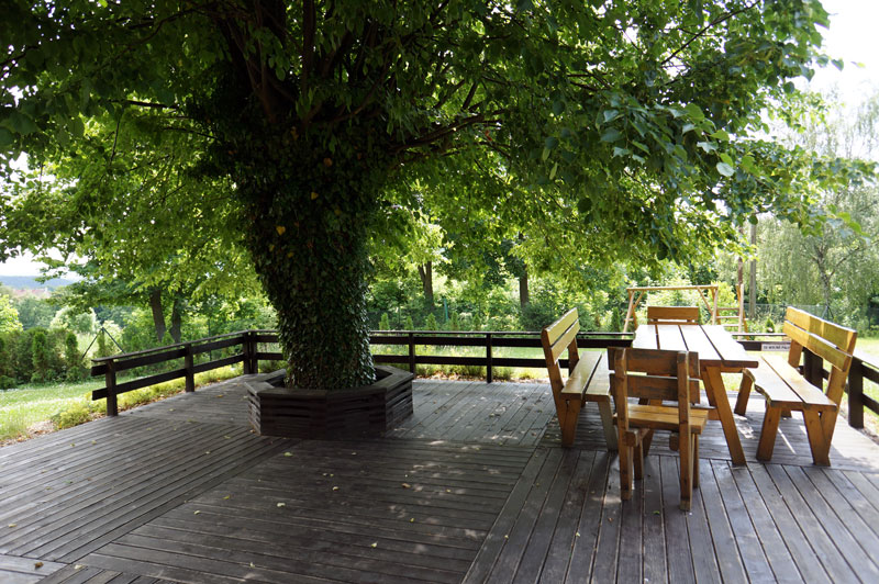 Przed wejściem do domu znajduje się duży drewniany taras okalający piękną starą lipę. Na tarasie do dyspozycji gości są dwa duże drewniane stoły z ławami, krzesła i rozkładane krzesła i leżaki. Ze wzglęu na swoje położenie (południe) oraz fakt, że taras jest zacieniony przez lipę, w pogodne poranki nasi goście bardzo chętnie urządzają sobie tu śniadania.