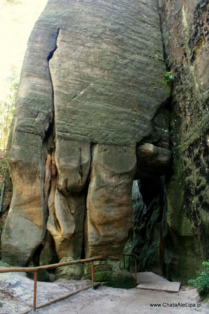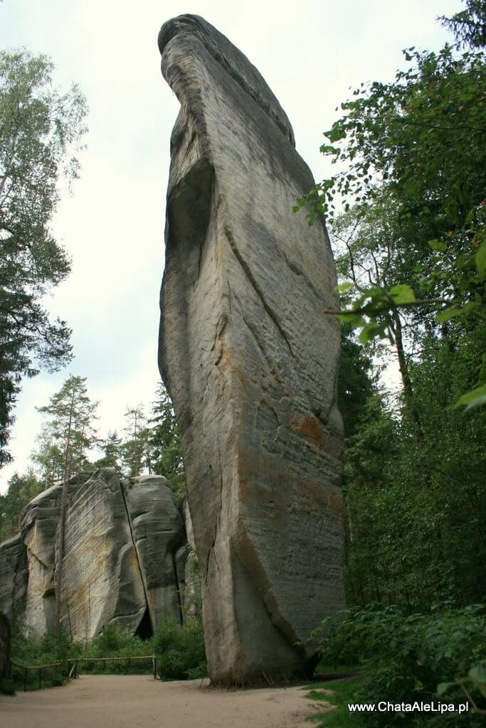 - Na trasie, nad skalnym przejściem wznosi się Wieża Elżbiety (Eliśćina veż). Pierwszego wejścia na tę piękna skałę dokonali już w roku 1947 wspinacze z Nachodu - Vladimir Śkaroupka, Miloslav Jirka i Miroslav Tomek. Przechodzimy przejściem w skałach i idziemy dalej obok Gromowego Kamienia z wykutym reliefem.